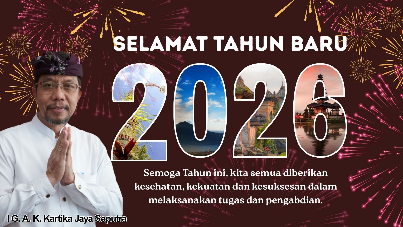 Kepala Dinas Pemajuan Masyarakat Adat Provinsi Bali, I G.A.K. Kartika Jaya Seputra, S.H., M.H. berserta seluruh pejabat dan staf lingkup Dinas Pemajuan Adat Provinsi Bali mengucapkan “Selamat Tahun Baru 2026, harapan utama di tahun ini adalah semoga selalu diberikan kesehatan, kekuatan dan kesuksesan dalam melaksanakan tugas dan pengabdian”.
